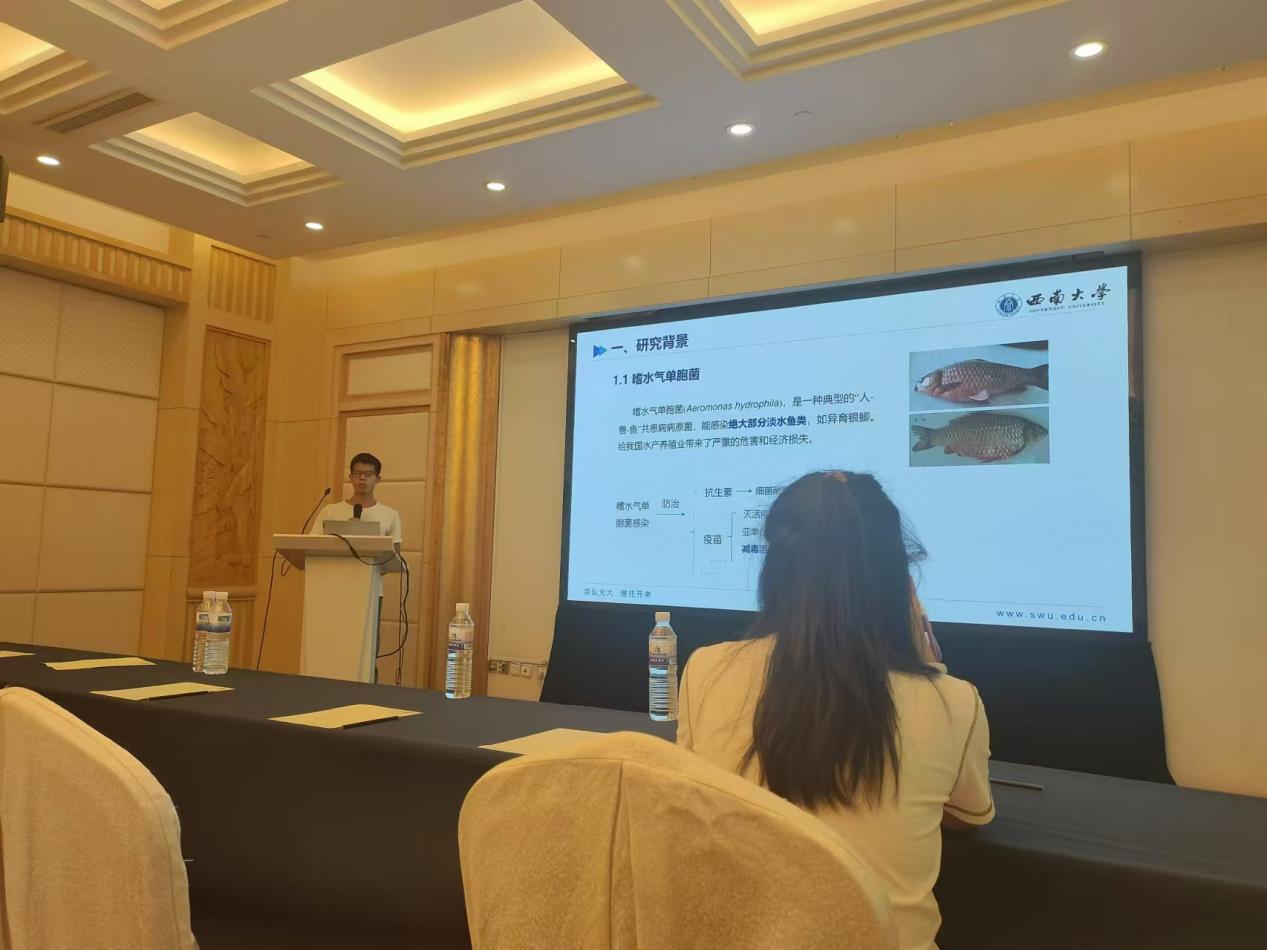 我院三名教师(吴荣华、何远法、朱松)和三名学生参加此次盛会。会议期间,吴荣华副教授做了题为“气单胞菌候选减毒活疫苗的开发及对鱼类的免疫保护效果评估”的分会场主题报告,其硕士研究生卢嘉慧、龙瑞分别做了题为“aroA和ppk1在维氏气单胞菌致病性中的作用及突变株AV-∆aroA/ppk1作为减毒活疫苗的效力评估”和“tapp基因在调节嗜水气单胞菌毒力中的功能及其作用机制”的主题报告。徐红艳教授的博士研究生姚静婷做了题为“鲤科鱼类卵巢组织细胞冷冻保存及复苏培养技术研究”的主题报告。