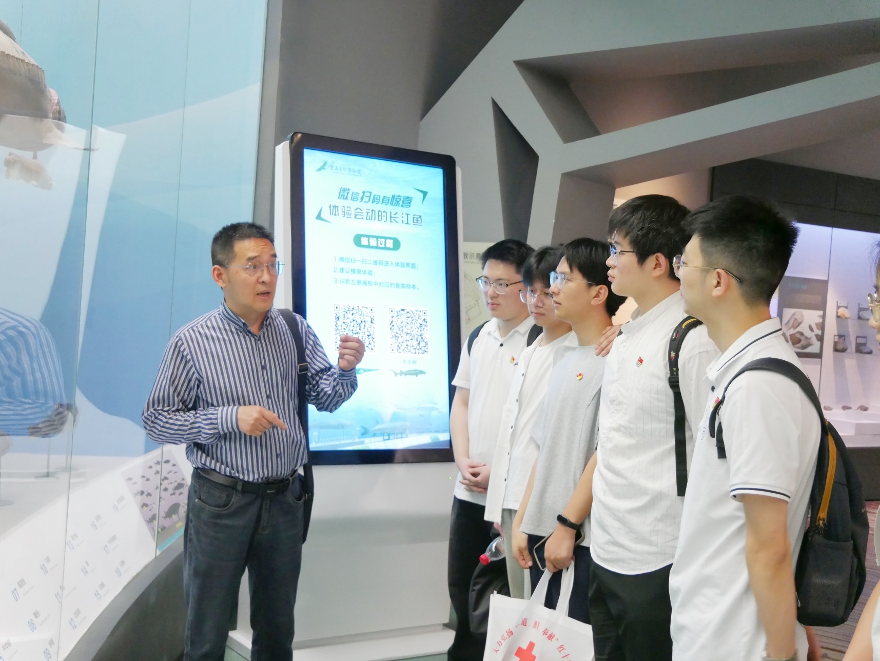 上午,支部成员抵达重庆自然博物馆参观学习。在讲解员的带领下,大家依次参观了“动物星球”“山水都市”“恐龙世界”等主题展厅。通过珍贵的古生物化石、沉浸式生态场景和详实的图文资料,支部成员们系统了解了地球46亿年的演变历程及生物多样性的重要意义。在“长江渔业资源”展区,周兴华老师为大家特别介绍了中华鲟、长吻鮠、鯮鱼等长江特有鱼类的分类特征和保护工作,这不仅加深了支部成员对长江流域水生生物多样性的理解,更让大家深刻认识到“保护生物多样性,守护生态环境”的责任感和使命感。
