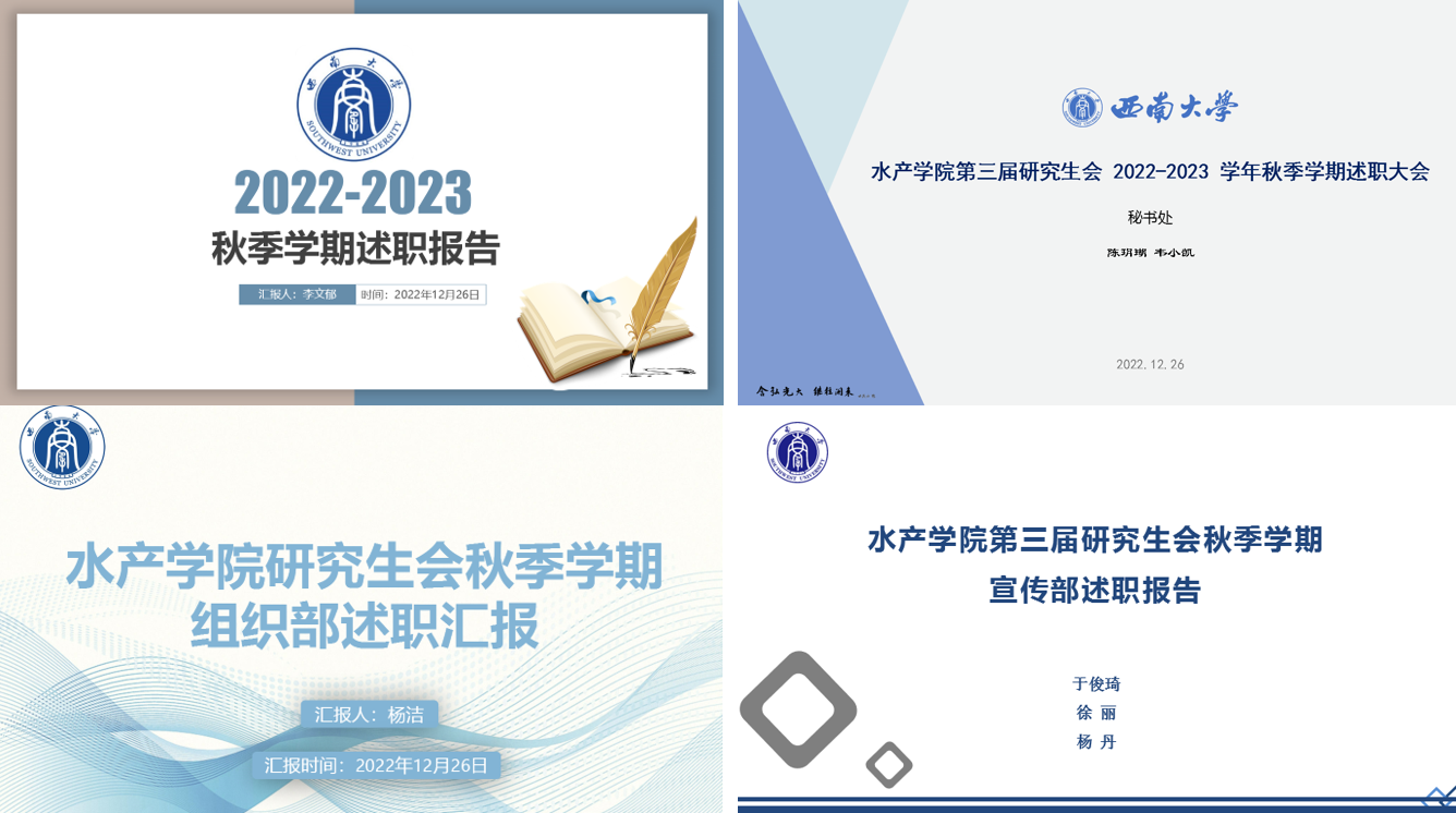 会上,研究生会主席团成员李文郁、聂臻韬和孟文旭依次述职,分别汇报了秋季学期研究生会分管部门的工作内容,总结了本学期的政治理论学习、组织队伍建设以及工作开展情况,对自我优缺点进行了深度剖析与反思,并对下半年的工作计划做了展望。