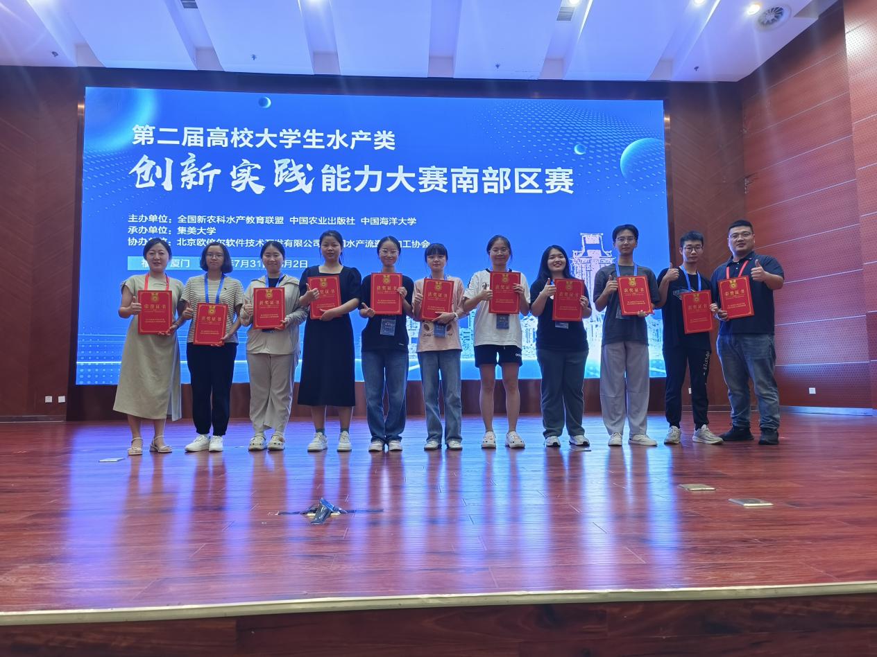 2024年7月31日-8月1日,由全国新农科水产教育联盟、中国农业出版社、中国海洋大学主办,集美大学承办的第二届高校大学生水产类创新实践能力大赛南部区赛决赛在集美大学举行。学院李芳副教授、朱松副教授带领9名本科生组建的3支队伍参赛并取得优异成绩。
