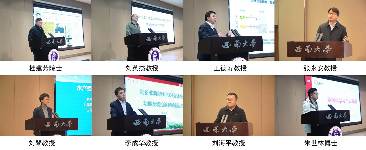 开幕式结束后,桂建芳院士作了题为“多倍体鲫属复合种的遗传基础解析与育种技术创新”的大会特邀报告。报告中,桂院士详细介绍了多倍体鲫独特的遗传特性、精准育种的挑战以及最新的技术创新成果,为与会者提供了宝贵的学术启发。随后,刘英杰教授、王德寿教授、张永安教授、刘琴教授、李成华教授、刘海平教授、朱世林博士分别以“十五五农业科技战略研究及相关思考”“罗非鱼经济性状遗传解析与基因编辑新种质创制”“草鱼B细胞的免疫功能和分化路径”“水产疫病免疫综合防控技术探索”“刺参非典型NLRC4受体免疫功能及调控途径的新认知”“新西部大开发视域下水产学科发展和思考”“基因科学与个人发展”为题的主题报告。PA视讯院长刘海平教授、科技处副处长徐洛浩教授主持学术报告环节。