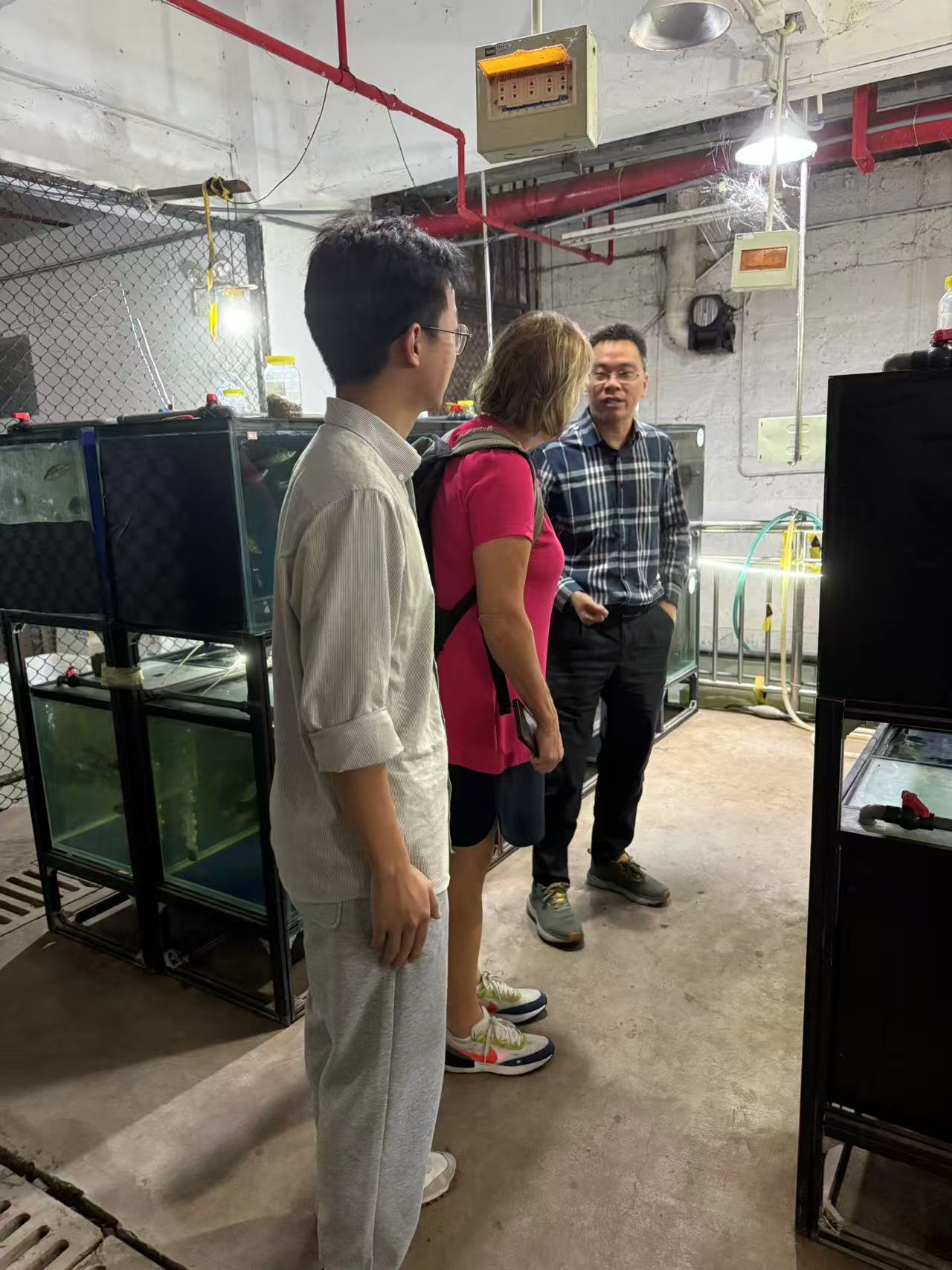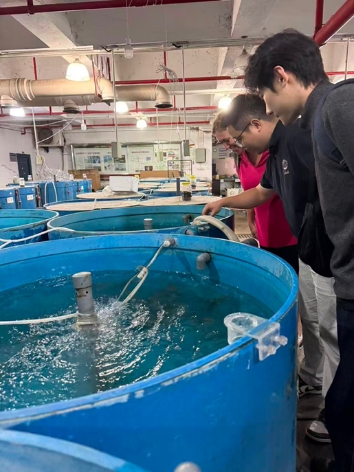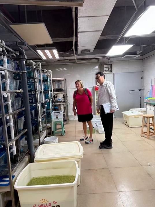 首先,在学院李云教授、陈拥军副教授以及王杰博士的陪同下,Debney博士一行人饶有兴致地参观了PA视讯的教学科研养殖基地。三位老师分别向Debney博士介绍了我院在淡水鱼类繁育、营养以及养殖等方面开展的工作以及取得的成就。她对基地现代化的养殖设施、规范化的管理模式以及在水产种质资源保护方面所做的工作给予了高度评价。参观过程中,双方就水产集约化养殖、循环水系统优化及生态健康养殖技术等话题进行了现场交流。