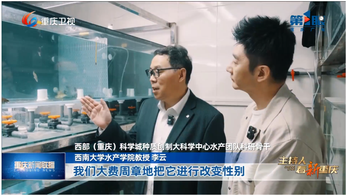 在此基础上,先后成功实现长江原种子代鳜的室内全人工繁殖,创制长江鳜原种子代性逆转XX伪雄鱼种质,再与正常雌鱼交配,成功创制原种子代速生“全雌鳜”苗种种质素材。2025年在西南大学校内繁育车间和合作企业分别实现长江“全雌鳜”苗种规模化繁育的突破。初步测试,全雌鳜苗种规格更整齐,摄食消化力强,生长速度比对照组快约30%,主要指标优于对照组。相关研究进展和成果已发表高水平研究论文10余篇,受到学界和社会的广泛关注,今年1月李云教授应邀出席“第四届三亚国际种业科学家大会”,在水产论坛作了鳜鱼种创的学术报告,鳜鱼成果两次在《重庆日报》报道,全雌鳜创制工作与本院刘海平教授相关研究保护工作一同接受重庆电视台第1眼新闻专访,在重庆卫视11月29日重庆新闻联播节目“奋进的重庆我们的“十四五”· 从舌尖美味到生命备份”播出采访报道(下图)。