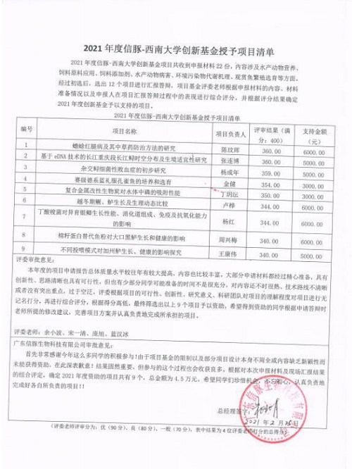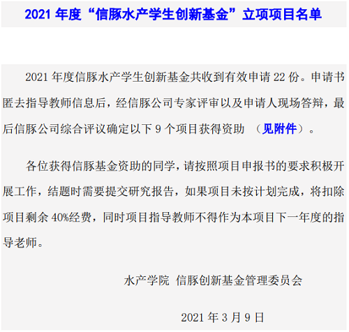 2021 年度“信豚水产学生创新基金”立项项目名单